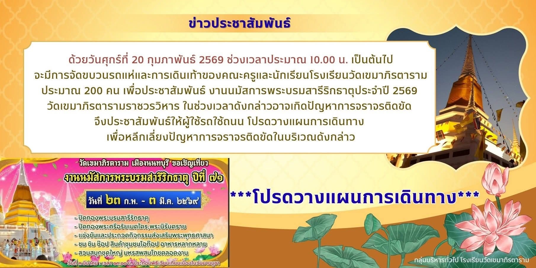 โปรดวางแผนการเดินทาง จะมีการจัดขบวน นักเรียนโรงเรียนวัดเขมาภิรตาราม