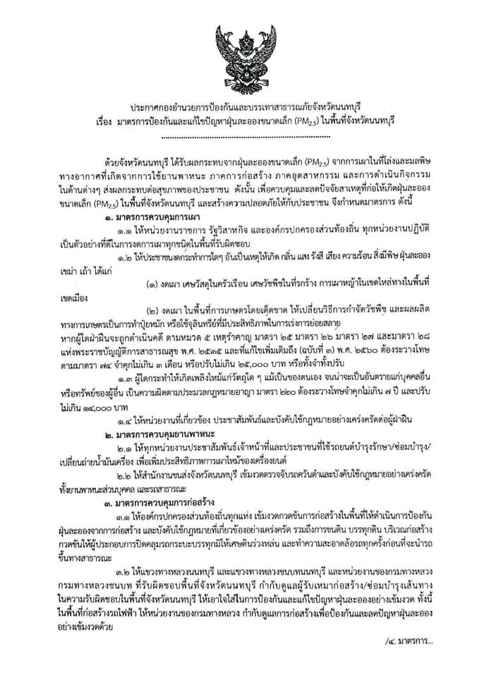 😷🚔 นนทบุรี เริ่มแล้ว‼️ประกาศมาตราการ ฝุ่นpm2.5🔥เข้มห้ามเผา (โทษทั้งจำทั้งปรับ)🚘ตรวจจับรถควันดำ🏢คุมก่อสร้าง/โรงงานปล่อยควัน/ล้างฝุ่นถนน