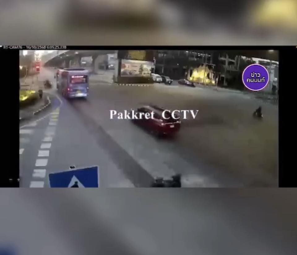 อุบัติเหตุ รถเมล์ไฟฟ้า สาย 150 ฝ่าไฟแดงชนรถมอเตอร์ไซค์รับจ้าง ที่ได้จังหวะไฟเขียว เหตุกลางห้าแยกปากเกร็ด อ.ปากเกร็ด จ.นนทบุรี วันนี้ 16 ตุลาคม 2568 เวลา 06.05 น.