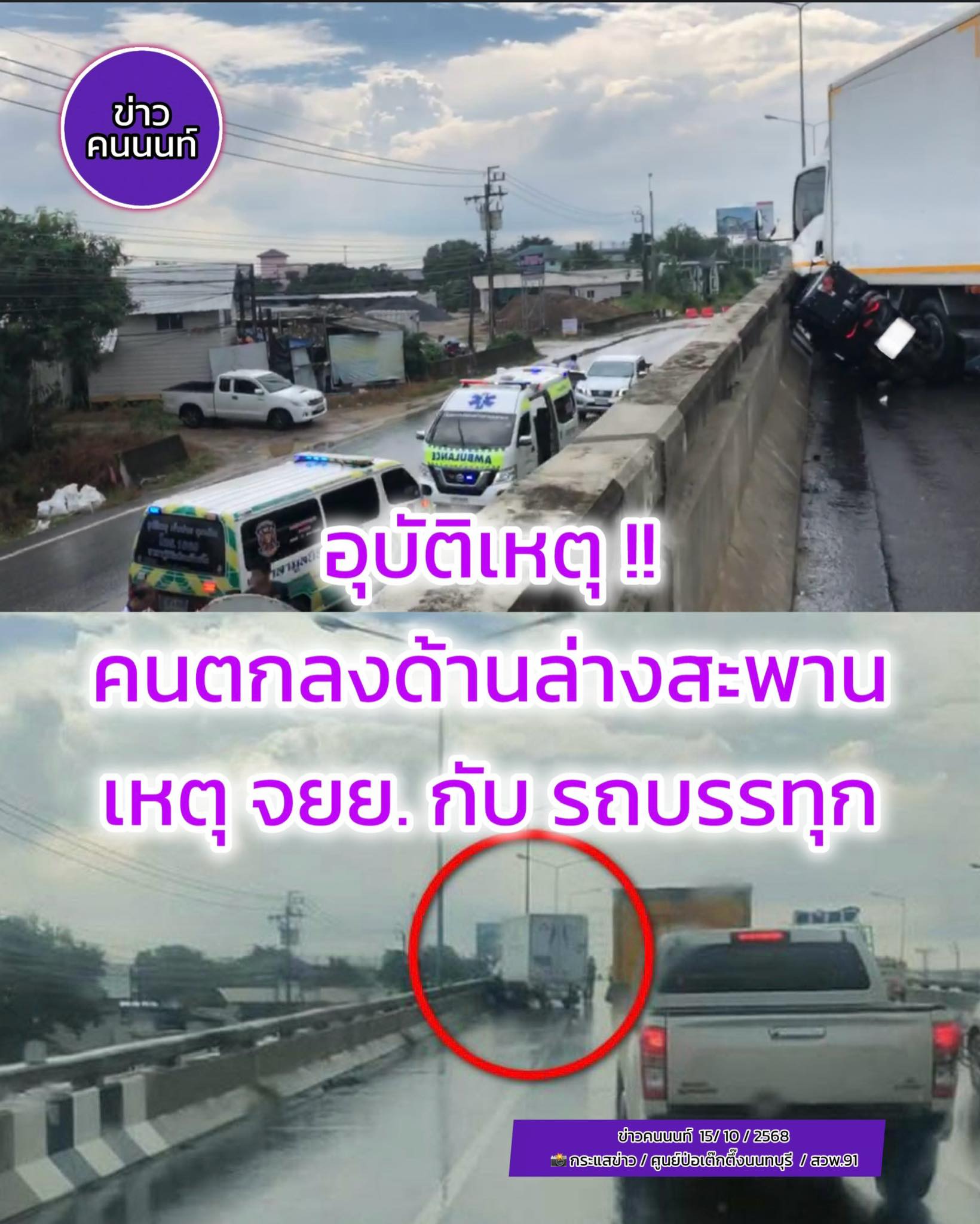 อุบัติเหตุ คนตกลงไปด้านล่างสะพาน เหตุ รถจักรยานยนต์ กับ รถบรรทุก