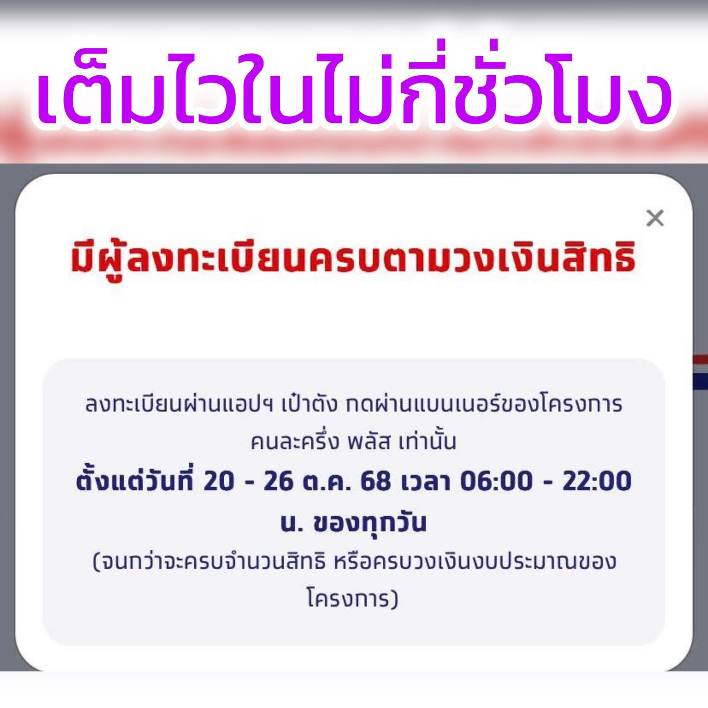 📲 #คนละครึ่งพลัส 20 ล้านสิทธิ เต็มภายใน 10 ชั่วโมง (16.00 น. : 20 ต.ค. 68)