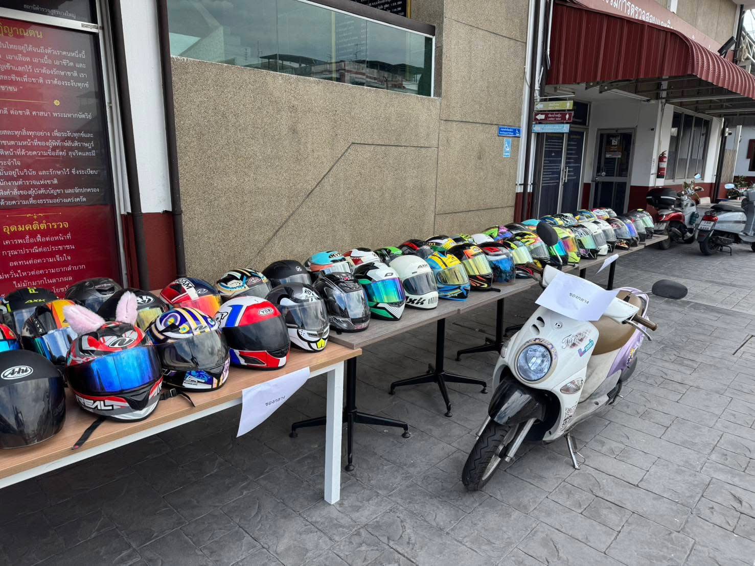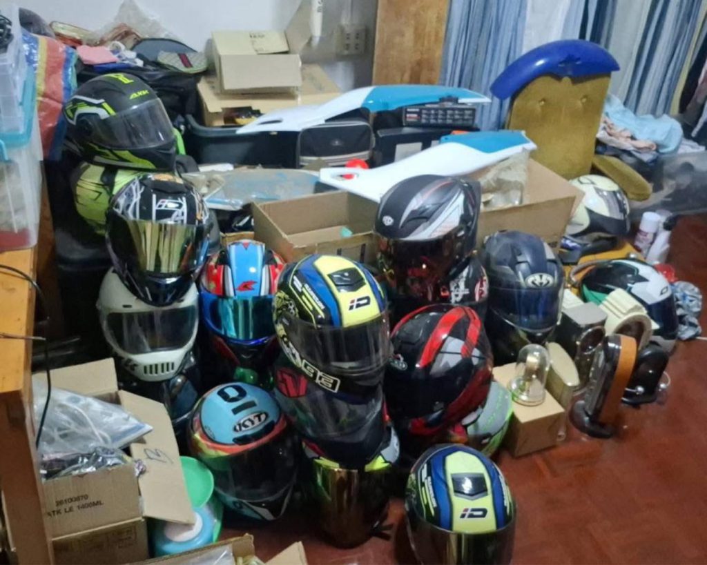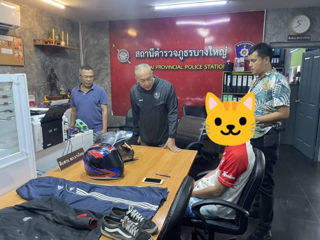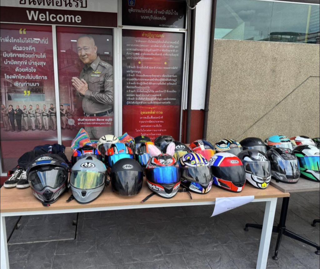 รวมถึง หมวกกันน็อกยี่ห้อ Arai สีเทา-ดำ-แดง มูลค่าประมาณ 40,000 ซึ่งเป็นทรัพย์สินของผู้เสียหายที่ถูกลักไปจากปั๊มน้ำมันย่านบางใหญ่