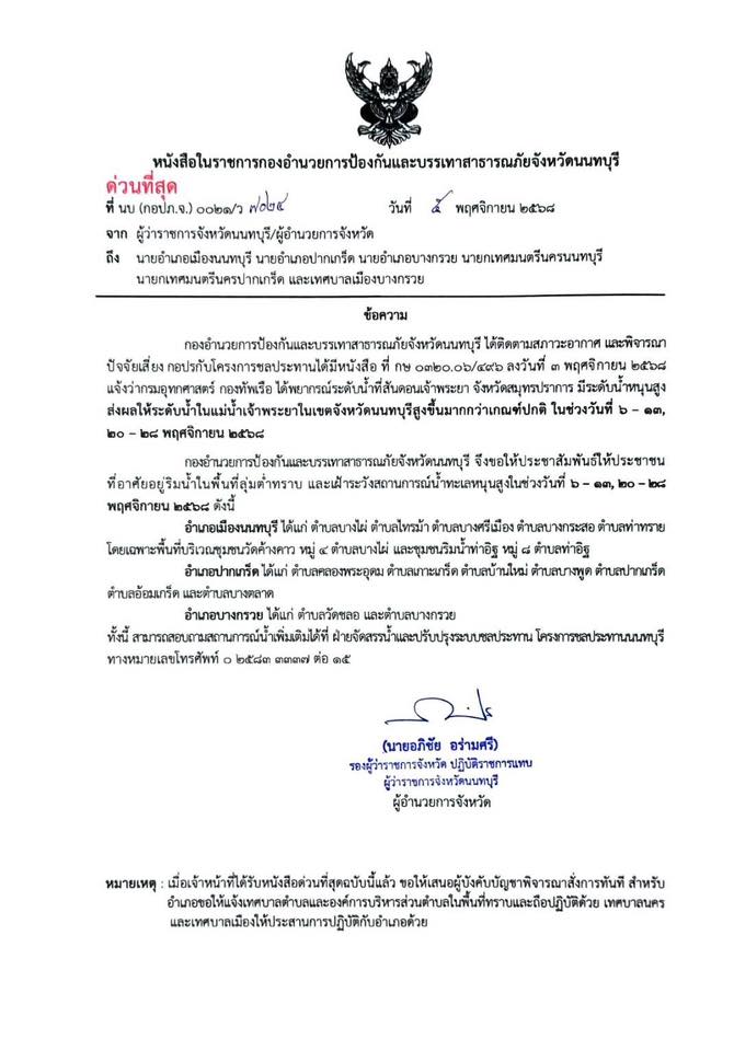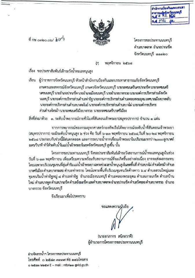 ปภ.นนทบุรี ประกาศเตือน น้ำทะเลหนุนสูง 6-13 พ.ย.68 และ 20-28 พ.ย.68 ปชช.อาศัยริมน้ำพื้นที่ลุ่มต่ำเฝ้าระวัง หนังสือในราชการกองอำนวยการป้องกันและบรรเทาสาธารณภัยจังหวัดนนทบุรี ด่วนที่สุด ที่ นบ (กอปภ.จ.) 0021/ว 7024 วันที่ 5 พฤศจิกายน 2568 . เฝ้าระวังน้ำทะเลหนุนสูง 2 ช่วง ช่วงวันที่ 6 – 13 พฤศจิกายน 2568 ช่วงวันที่ 20 – 28 พฤศจิกายน 2568 ขอให้ประชาชนที่อาศัยริมน้ำหรือพื้นที่ลุ่มต่ำ เฝ้าระวังสถานการณ์