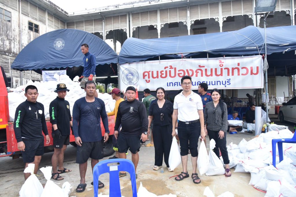 วันที่ 9 พฤศจิกายน 2568 เวลา 17.00 น. ณ ศูนย์ป้องกันน้ำท่วมเทศบาลนครนนทบุรี สำนักงานเทศบาลนครนนทบุรีระดมกำลังเจ้าหน้าที่เร่งกรอกกระสอบทรายทำแนวกั้นบริเวณริมเขื่อนท่าน้ำนนท์ เพื่อป้องกันน้ำแม่น้ำเจ้าพระยาเอ่อล้นตลิ่งในช่วงน้ำขึ้น