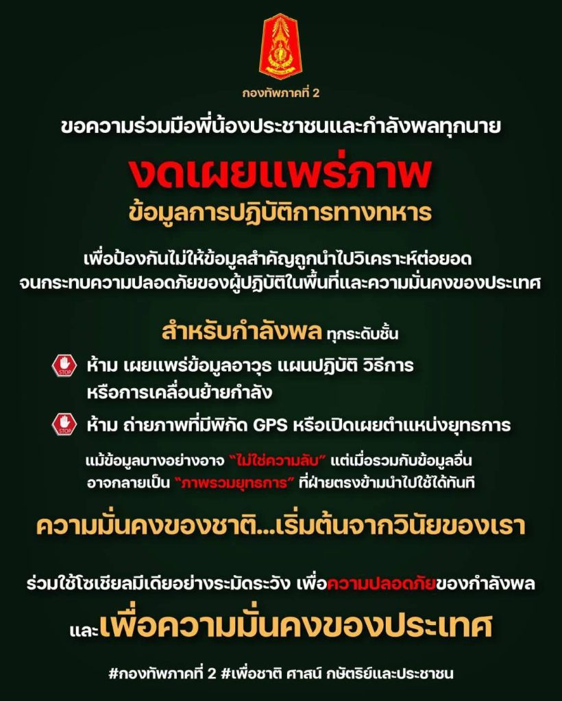 สำหรับกำลังพล ทุกระดับชั้น ห้าม เผยแพร่ข้อมูลอาวุร แผนปฏิบัติ วิธีการ หรือการเคลื่อนย้ายกำลัง