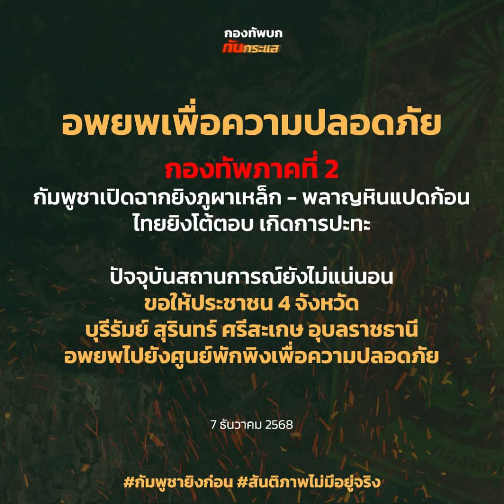 ขอให้ชาวบ้าน แนวอำเภอชายแดน 4 จังหวัด บุรีรัมย์ สุรินทร์ ศรีสะเกษ อุบลราชธานี อพยพไปยัง ศูนย์พักพิง เพื่อความปลอดภัย 07/12/68