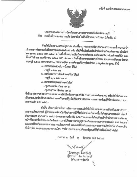 ประกาศเขตพื้นที่ประสบสาธารณภัย (อุทกภัย) ในพื้นที่อำเภอบางบัวทอง ฉบับที่2