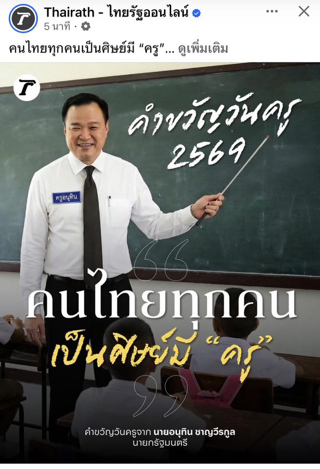 คนไทยทุกคนเป็นศิษย์มี“ครู”คำขวัญ #วันครู 2569 นายอนุทิน ชาญวีรกุล นายกรัฐมนตรีและ รมว.มหาดไทย มอบคำขวัญเนื่องในโอกาสวันครู ครั้งที่ 70 ประจำปี 2569 ความว่าคนไทยทุกคนเป็นศิษย์มี “ครู”#วันครู #คำขวัญวันครู #วันครู2569 Screenshot