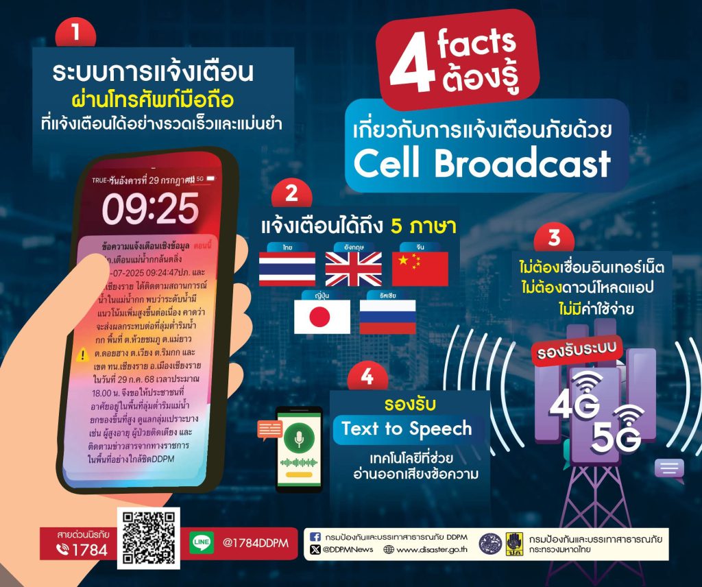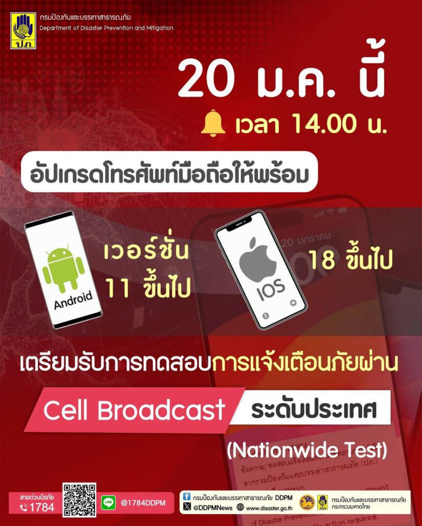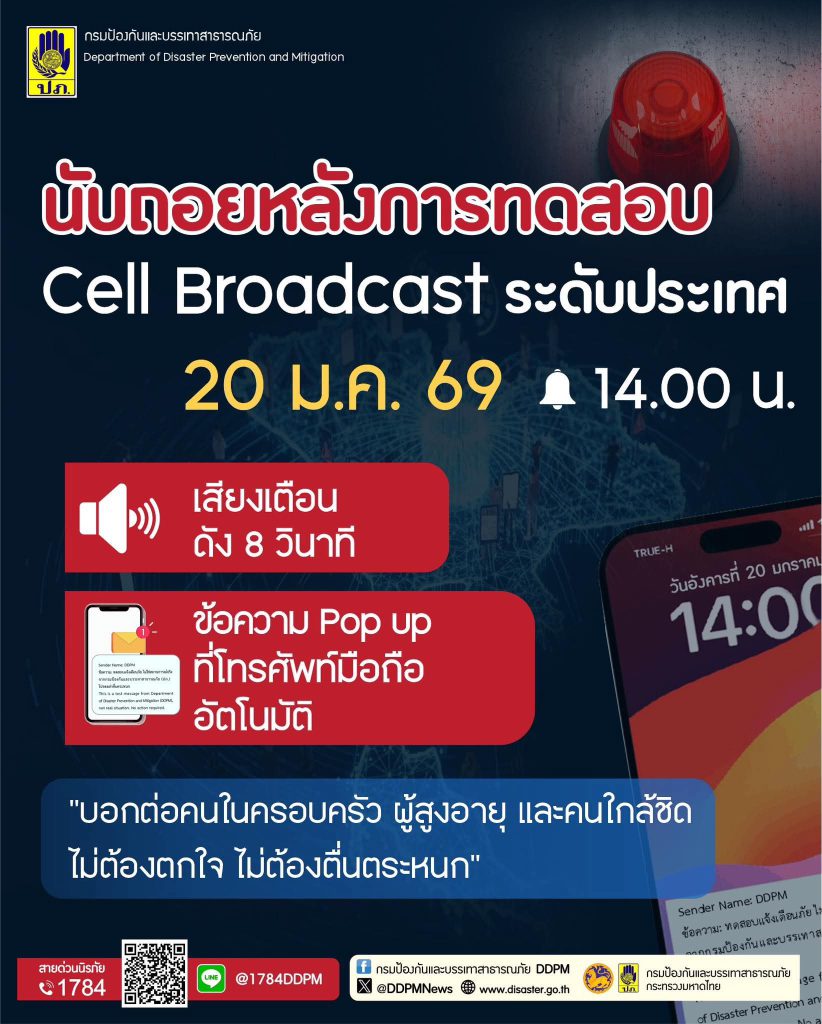 อย่าตกใจ! พรุ่งนี้ (20 ม.ค.) เวลา 14.00 น. ปภ. ทดสอบระบบแจ้งเตือนภัย Cell Broadcast ระดับประเทศ มีข้อความพร้อมเสียงดัง8 วินาที