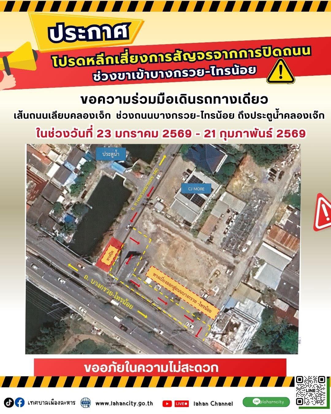 ประกาศแจ้งปิดซ่อมถนนเลียบคลองเจ็ก – ประตูน้ำคลองเจ็กฝั่งถนนบางกรวย – ไทรน้อย ตั้งแต่ 23 มกราคม – 21 กุมภาพันธ์ 2569