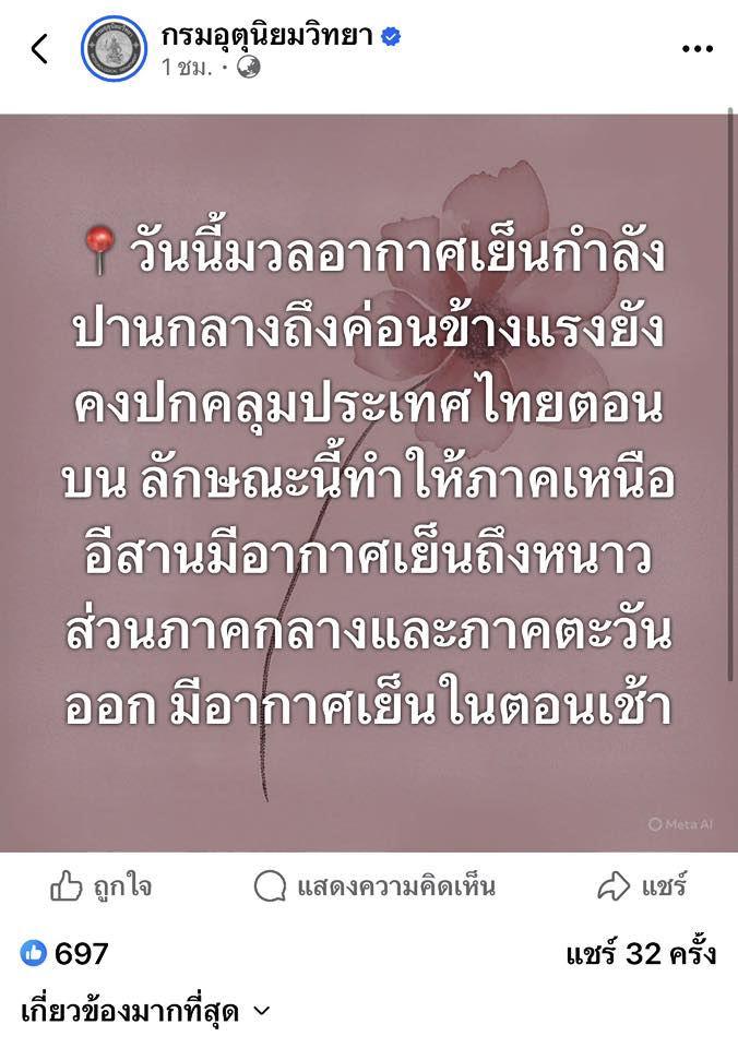 กรมอุตุนิยมวิทยา แจ้ง วันนี้มวลอากาศเย็นกำลังปานกลางถึงค่อนข้างแรงยังคงปกคลุมประเทศไทยตอนบน ลักษณะนี้ทำให้ภาคเหนือ อีสานมีอากาศเย็นถึงหนาว ส่วนภาคกลางและภาคตะวันออก มีอากาศเย็นในตอนเช้า