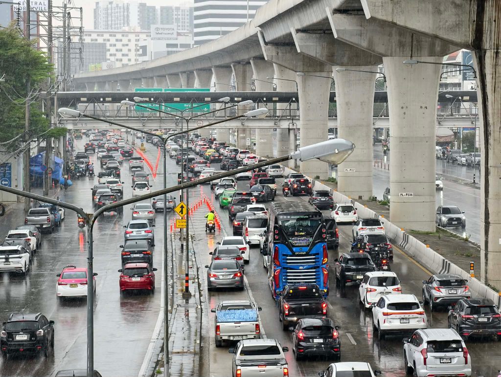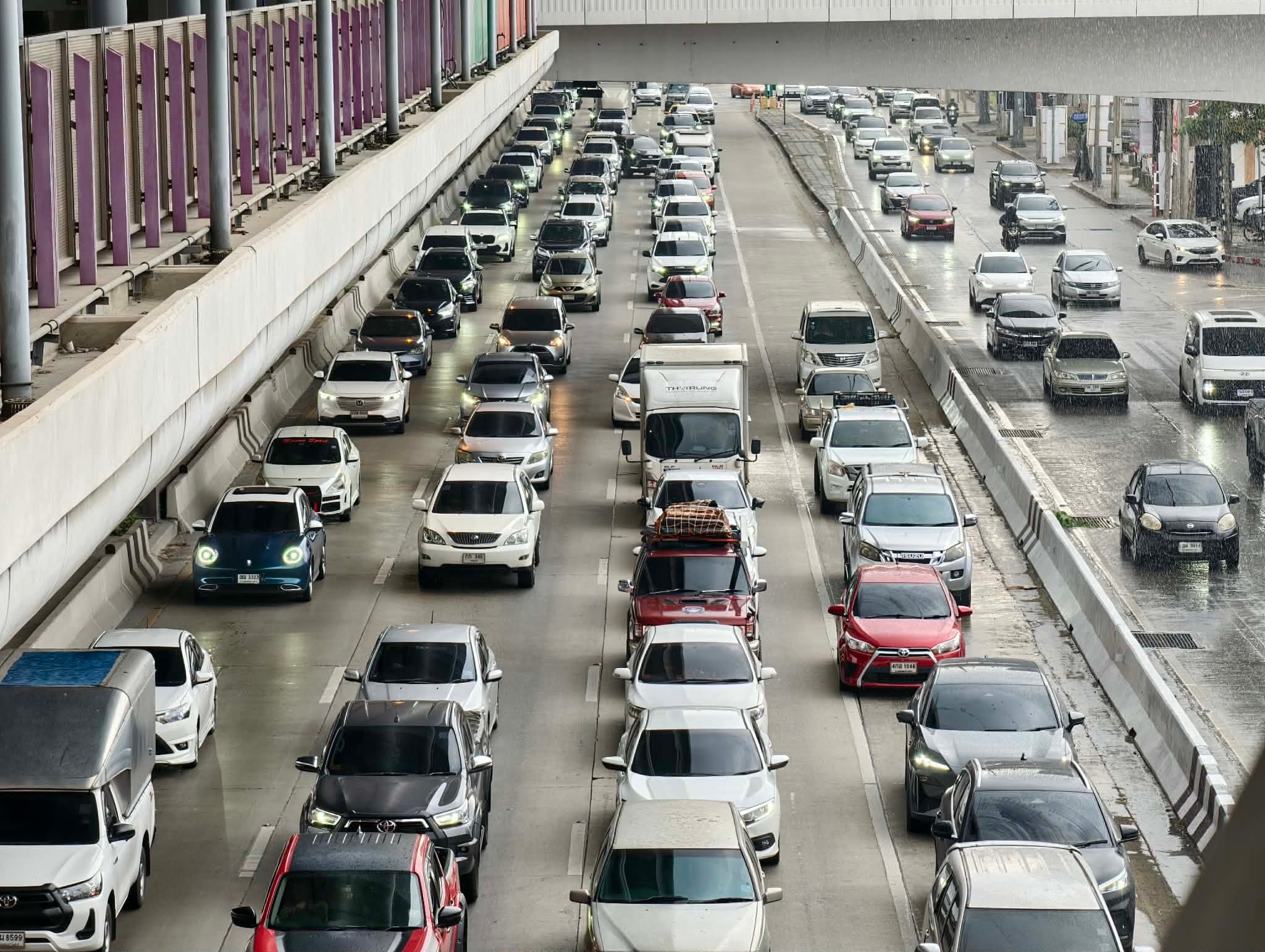 รายงานการจราจร ถนนรัตนาธิเบศร์ ช่วงหน้าห้างเซ็นทรัล นอร์ทวิลล์ มุ่งหน้า แยกแคราย มีปริมาณรถติดสะสมยาวเต็มทุกช่องทาง