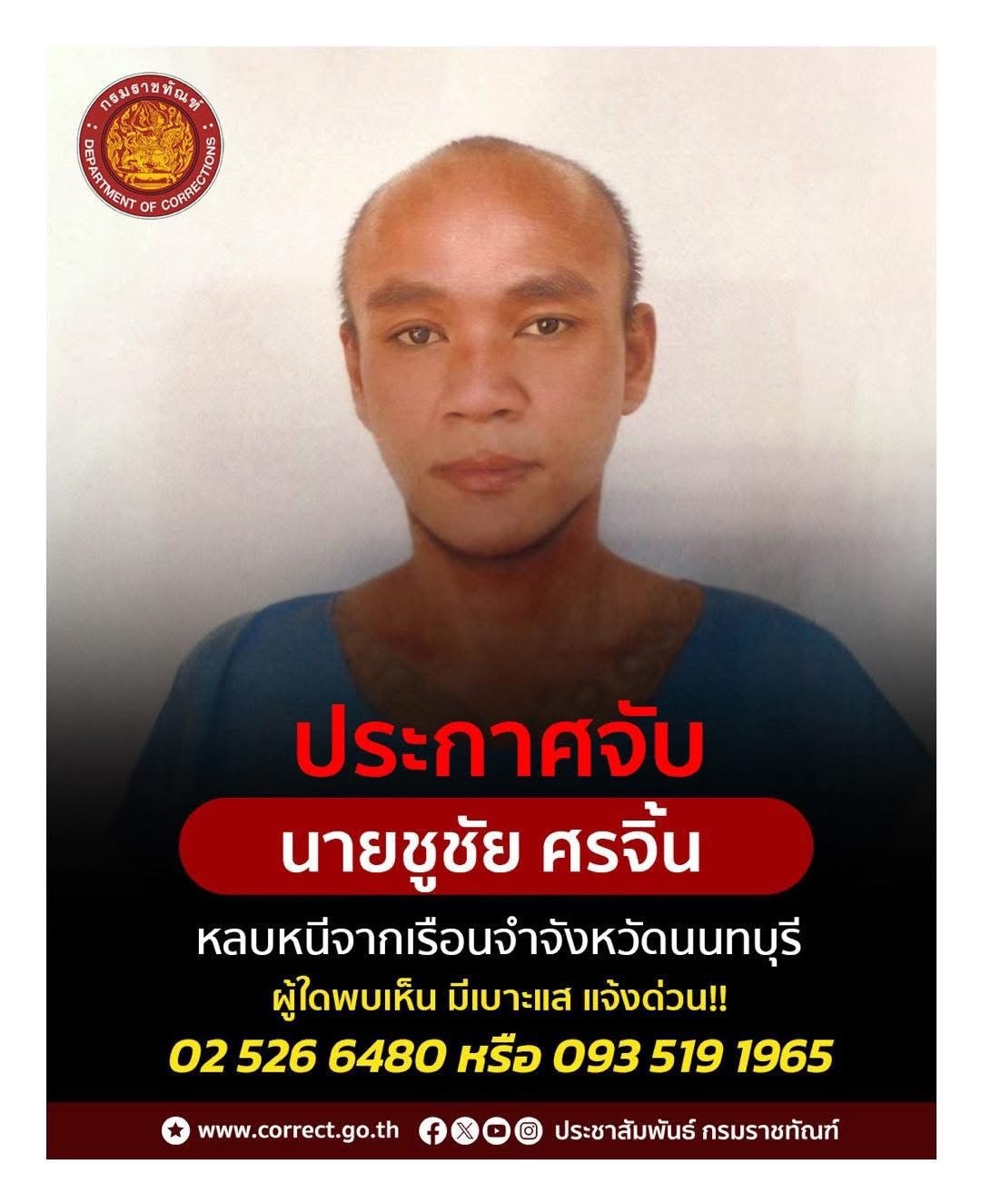 กรมราชทัณฑ์ ขอรายงานว่า เมื่อวันที่ 13 กุมภาพันธ์ 2569 เวลาประมาณ 02.00 นาฬิกา นายชูชัย ศรจิ้น อายุ 40 ปี ฐานความผิดร่วมกันลักทรัพยในเวลากลางคืนโดยใช้ยานพาหนะเพื่อสะดวกแก่การกระทำความผิดหรือการพาทรัพย์นั้นไปหรือเพื่อให้พ้นจากการจับกุม
