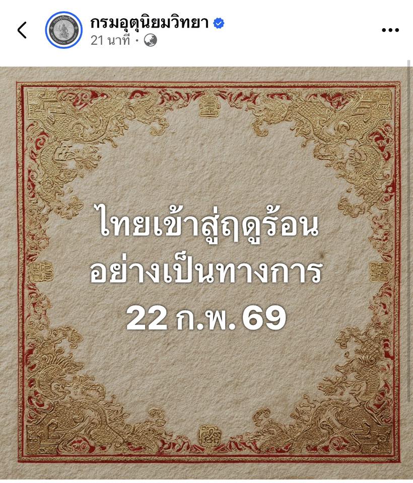 ไทยเข้าสู่ #ฤดูร้อนอย่างเป็นทางการ22 ก.พ. 69 กรมอุตุฯ ประกาศ ประเทศไทยเข้าฤดูร้อนประจำปี2569 วันที่ 22 กุมภาพันธ์ นี้ โดยช่วงดังกล่าว จะมีพายุฤดูร้อนเกิดขึ้นหลายพื้นที่ ในภาคอีสาน ภาคกลาง ภาคตะวันออก