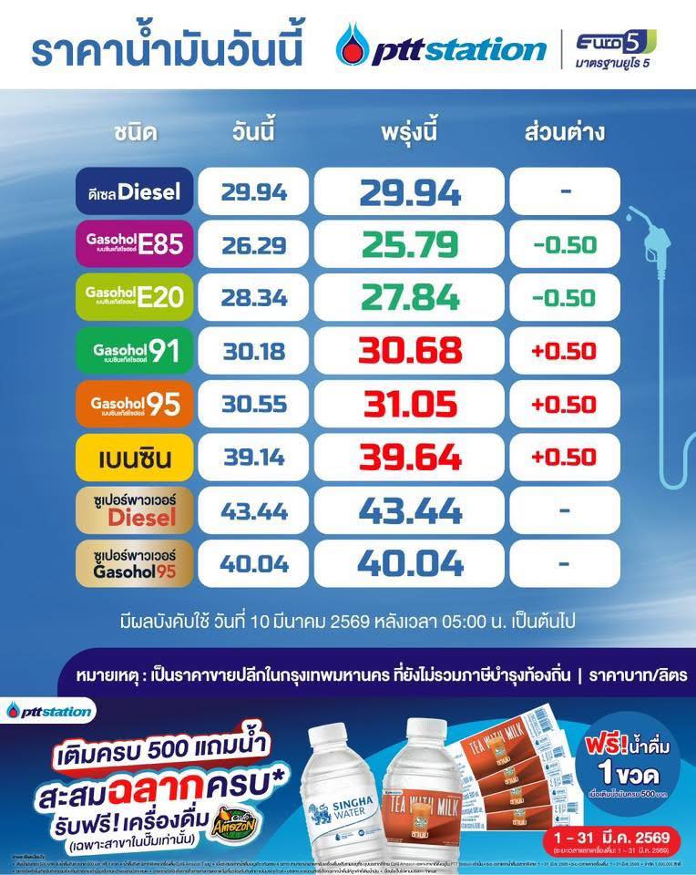 “ปตท.-บางจาก” ปรับราคาน้ำมันเบนซิน-แก๊สโซฮอล์ทุกชนิด เพิ่มขึ้น 0.50 สตางค์/ลิตร