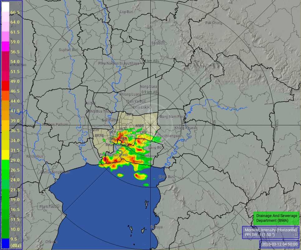 วันที่ 12 มีนาคม 2569 เวลา 04.45 น. / ฝนเล็กน้อย-ปานกลาง เขตราชเทวี พญาไท ดินแดง ห้วยขวาง วังทองหลาง บางกะปิ บึงกุ่ม คันนายาว คลองสามวา ประเวศ ลาดกระบัง หนองจอก ฝั่งพระนครตอนล่าง ต่อเนื่อง จ.สมุทรปราการ เคลื่อนทิศตะวันออก แนวโน้มคงที่