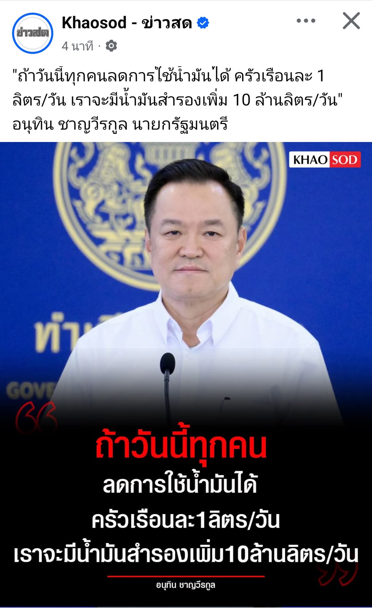 นายกฯบอกคนไทยมี 10 ล้านครอบครัว หากประหยัดน้ำมันครอบครัวละ 1 ลิตร/วัน ประเทศจะประหยัดทันที 10 ล้านลิตร/วัน หรือ 400 ล้านบาท/วัน