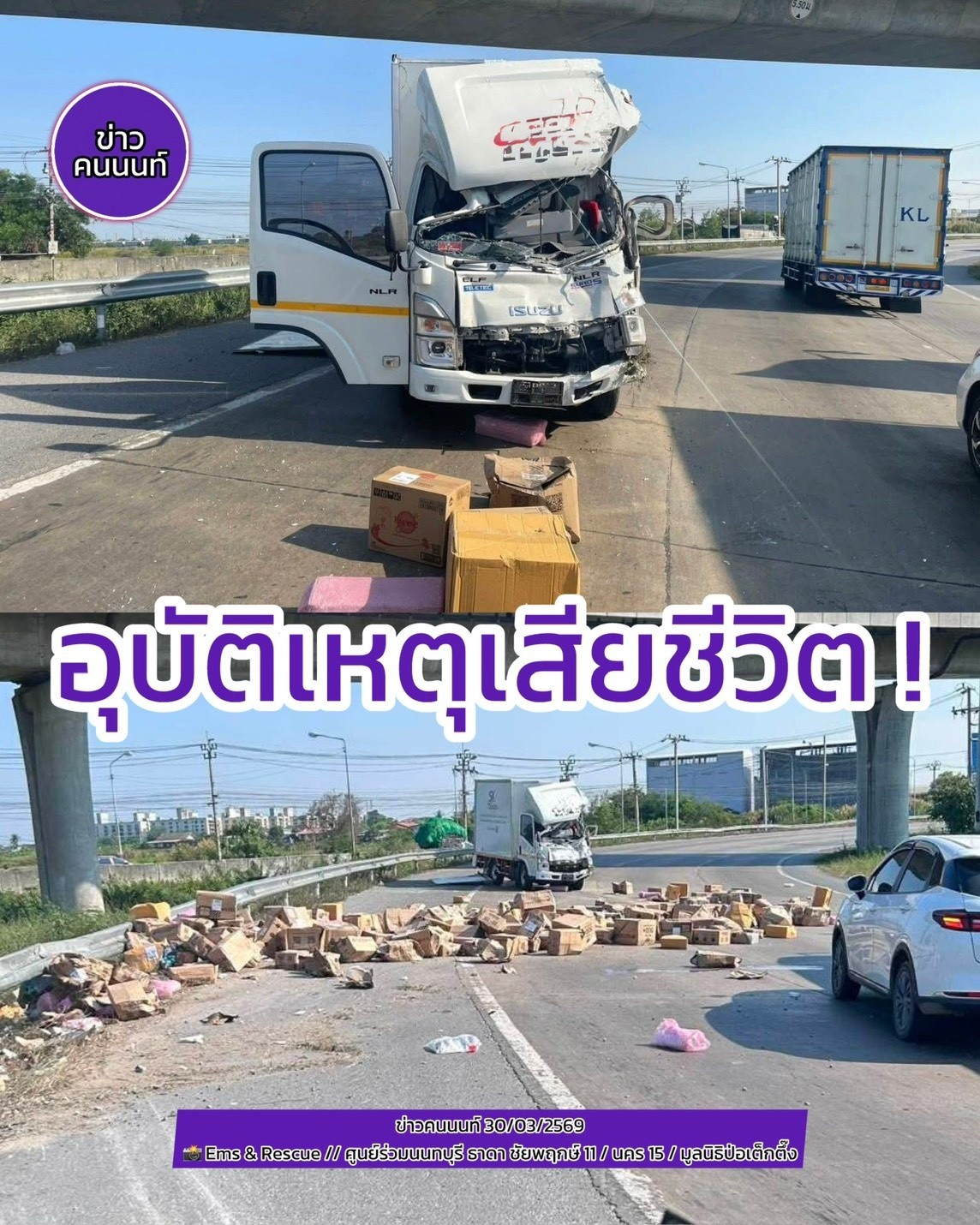 อุบัติเหตุ รถขนส่งพัสดุ เสียหลักพลิกตะแคง มีผู้เสียชีวิต 1 ราย และมีกล่องพัสดุตกหล่นกีดขวางการจราจร เหตุ 16.00 น. วันนี้ 31 มีนาคม 2569