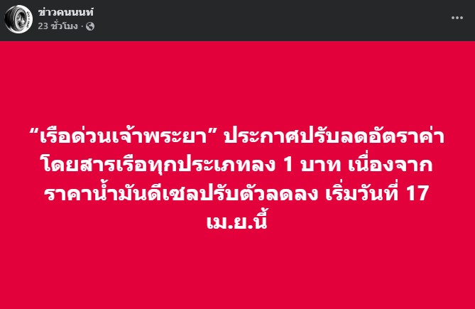 “เรือด่วนเจ้าพระยา” ประกาศปรับลดอัตราค่าโดยสารเรือทุกประเภทลง 1 บาท เนื่องจากราคาน้ำมันดีเซลปรับตัวลดลง เริ่มวันที่ 17 เม.ย.นี้
