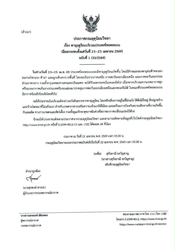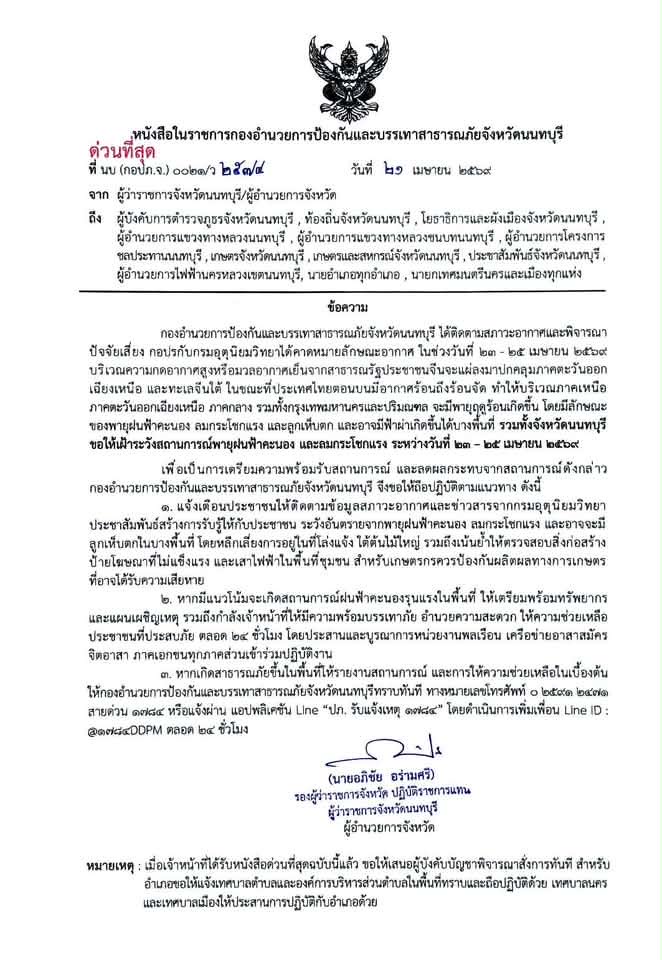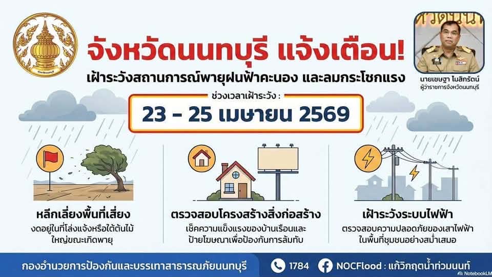 ปภ.นนทบุรี เตือนเฝ้าระวัง #พายุฝน #ลมแรง 23 – 25 เม.ย.69 . จังหวัดนนทบุรี เฝ้าระวังพายุฝนและลมแรง วันที่ 23 – 25 เมษายน 2569 เตรียมตัวรับมือพายุฤดูร้อนช่วงปลายเดือนนี้! จังหวัดนนทบุรีเน้นย้ำ 3 มาตรการความปลอดภัย : งดอยู่ในที่โล่งแจ้ง และใต้ต้นไม้ใหญ่ เช็คความแข็งแรงของบ้านเรือน และป้ายโฆษณา สอดส่องสายไฟและเสาไฟฟ้า รอบๆ บ้าน พบเหตุฉุกเฉินหรือต้องการความช่วยเหลือ โทรสายด่วน 1784 .
